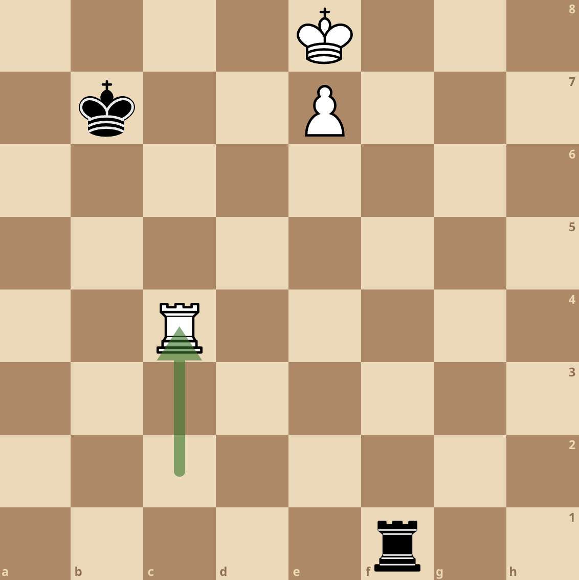 Let’s assume it is black’s turn here. The best move for black is Rf1 which prevents the white king from moving to any squares. But it is likely that your first instinct as black was Rb8+. Though both Rf1 and Rb8+ are losing for black (white wins in this position no matter what, which we will see soon), Rb8+ loses much quicker due to Kf7, Kd7, Rd2+ forcing the black king to vacate the d-file, Kc7, and e8=Q.